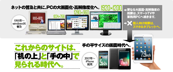 サイトを作成する場合、最初に決めなければならない要素に横幅があります。この横幅…所謂、紙面の大きさが決まらなければ、サイトのデザインが出来ほど重要な要素です。しかし、この重要な要素も、時代の流れと共に変化してきました。1995年、Windows95の登場で、インターネットの普及に加速がつきます。当時、ディスプレイの解像度は800×600が推奨スペックです。Windows98の時代には、1024×786へ。WindowsXP、WindowsVista、Windows7と、OSの変遷と共にディスプレイは大画面化し・解像度も大きくなり、サイトの横幅もドンドン広くなっていきました。
