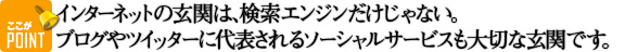 最近、困ったことに、ネット利用者の意識が大きく変化しています。少し前までは、ネットに繋げば、まずGoogleやYahooで検索し、ネットサーフィンを始めましたよね。今はどうでしょうか?ショッピングが目的なら、迷わず楽天やAmazonに行くでしょう。ニュースを知りたければ、ニュースサイトへ直行し、お気に入りの情報があるなら、行きつけのBLOGへ飛びます。ネット仲間と会話をしたいならツイッターが便利です。ネットのメイン玄関だった検索エンジンが、メインとは呼べなくなっています。と、言いながらも検索エンジンが、重要な玄関の一つである事に変わりはありません。今、何十万、何百万もの会員を有するブログやツイッターなどのソーシャルサービスが、検索エンジンと並ぶほどの大きな玄関の役割を持つようになりました。最大限にサイトの活用を考えるなら、ブログの利用もまた、重要なサイト活用のひとつとなります。